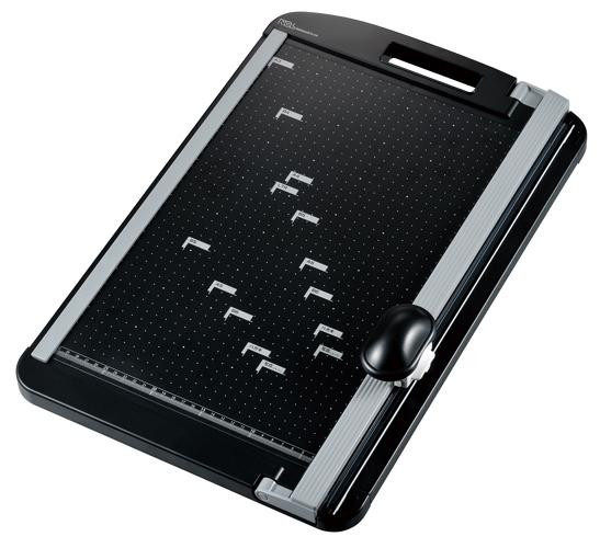 取っ手付きのデザインで持ち運びやすい!!1cmの基本グリッドと5cm間隔の表示と特定のサイズをシンプルに表示しました。紙あて定規(マグネット式)付きで、任意のサイズに容易にセットでき、刃の交換もカンタンです。本体裏面のポケットに交換用のミシン目刃を収納。最大約10枚の裁断が可能です。 |