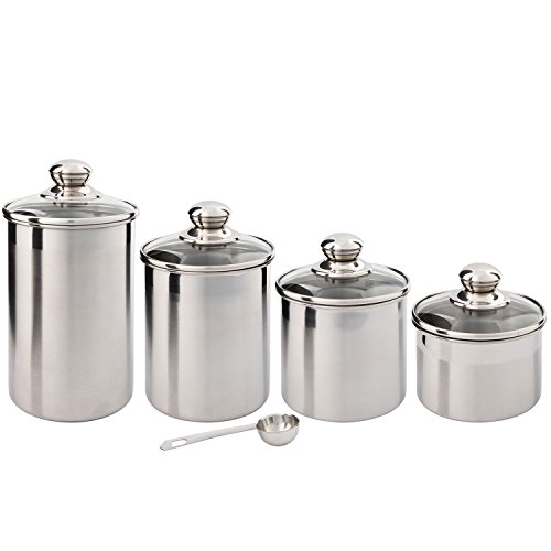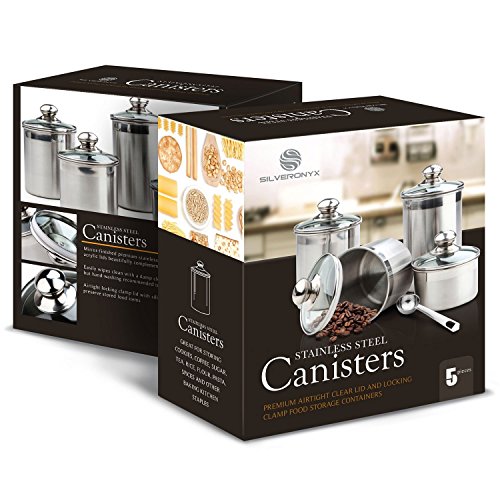 Canister Set Stainless Steel - 5-Piece with Glass Lids and Scoop - Small to Medium Sized Canister Sets For Kitchen Counter, Tea Coffee Sugar Canisters by SilverOnyx - 5pc Glass Lids
