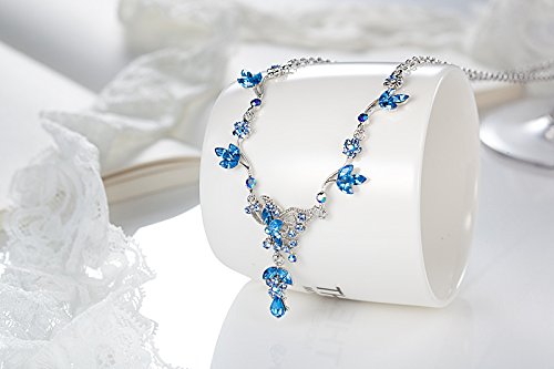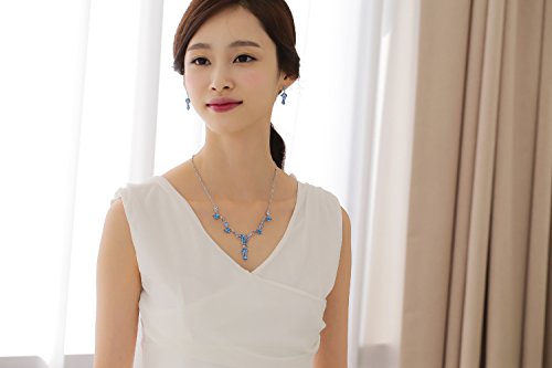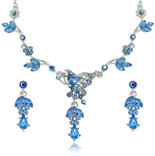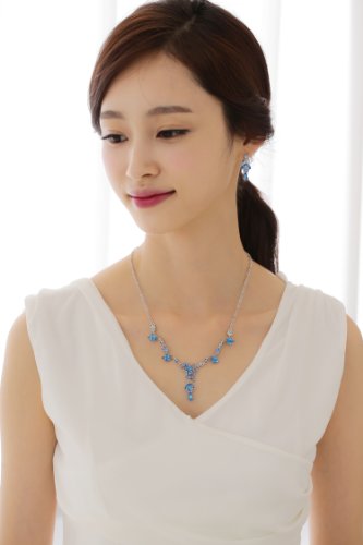 This necklace and earring set offer a classic feminine style, making it a fantastic choice for evening wear and looks exquisite with white dresses. In fact, it has proven to be popular among brides and bridesmaids. The necklace is made up of flowers and petals along a curvy chain, connecting to an artistic cluster of crystals with petals in the middle. From this cluster hang two petals enveloping a flower and a teardrop shaped crystal directly below. The earrings match this same pattern with the flower and teardrop dangling from a single crystal on the post. The chain is rhodium plated for tarnish resistance.Feature