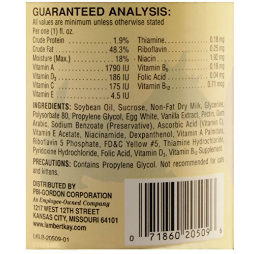Lambert Kay DYNE High Calorie Liquid Dietary Supplement for Dogs, 16 Ounces provides approximately 150 calories per ounce and contains vitamins to give additional support to dogs when given as a supplement to their regular diet. Dyne is formulated to contain a maximum of nutritive value in a minimum of liquid volume. Dyne supplies added calories to aid in weight gain or to resist stress conditions. The palatable, highly concentrated source of food energy in Dyne has been proven to be of value in many different stress related conditions including: underweight dogs, picky eaters, pregnant or lactating dogs, stressed dogs, dehydrated or geriatric dogs. Dyne may be fed as is to animals that are unable to eat or top dressed over the animal's normal diet. When diluted with water it can be used to combat dehydration. Dyne has a delicious vanilla flavor that dogs loves so it encourages them to consume Dyne and their food when it is poured over their food. Energize your dog with Dyne. Not recommended for cats and kittens. Proudly Made In the USA.Feature