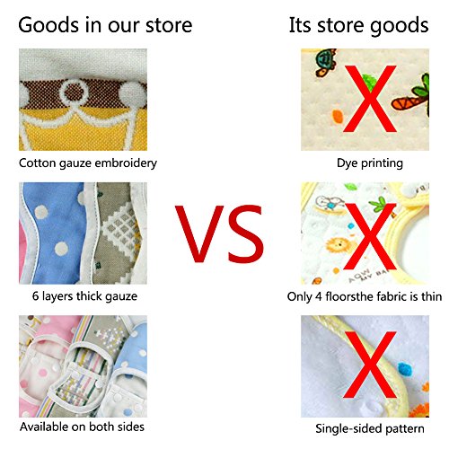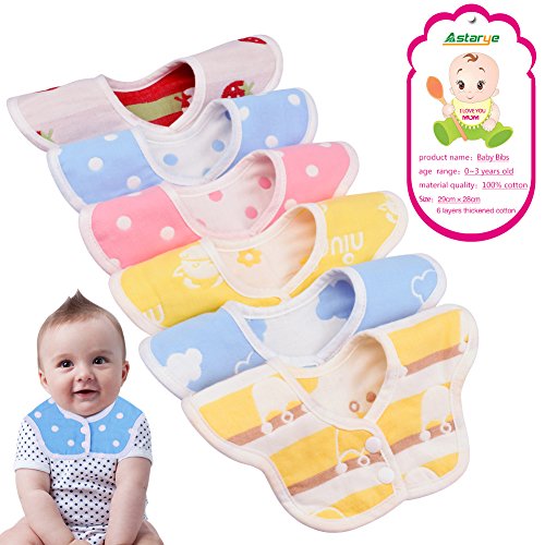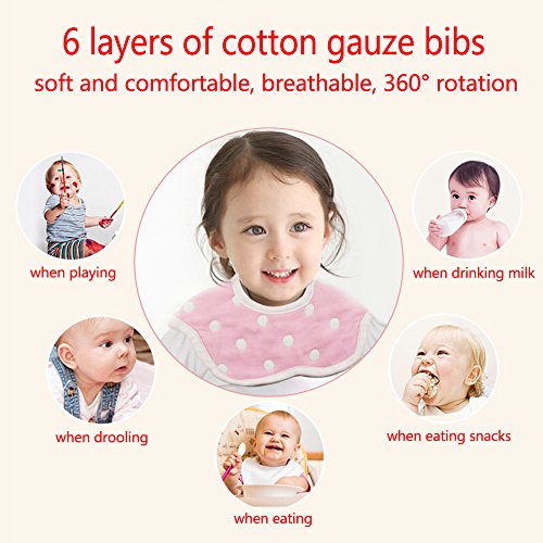 -. Feature : Dimensions: 26 * 28 cm, neck width: 10 cm, very suitable for your baby. / Material: Made of six layers of 100% natural cotton, it is very soft and protects your baby's delicate skin, you can use it with confidence. It's perfect for a child of 0-3 years. / Include:The colorful pattern, 6 pieces with cute designs, will be a good gift for your child. / Advantage: Excellent breathability / water absorption, keeping it fresh and clean at any time, you can use it comfortably and safely. In addition, it is a rotatable bib that can be changed in two ways, it can be rotated 360 °, available on two sides, and with excellent usability. / Why to use:When the child starts to grow teeth, the spit increases and often wets the clothes. Furthermore, when it is cooked, rice is often dropped onto clothes and make clothes dirty. Some children like to put their clothes in their mouth and chew them. If you have a bib, you will not have to worry about messing up your baby's clothes and your baby will no longer put dirty clothes in his mouth, and it will be comfortable.