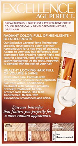 Excellence age perfect hair color was formulated specifically to color gray hair harmoniously for a new type of coverage. It adapts to very gray hair differently than pigmented hair, creating natural highs and lows for a layered, tonal effect, as if it was subtly highlighted. At the roots, regrowth is blended with the rest of your hair. The restorative caring formula with pro-keratine complex helps replenish hair from within. Hair feels transformed, thicker, with exceptional smoothness and shine.Feature