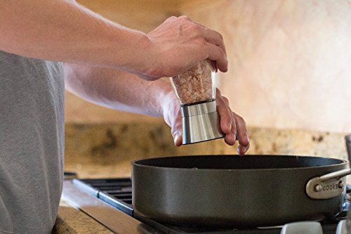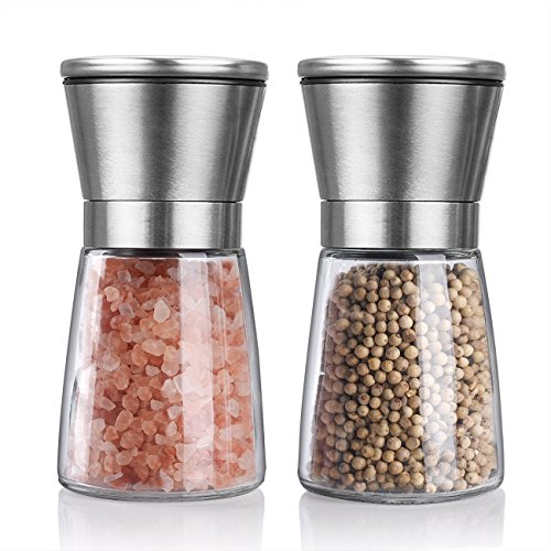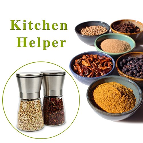SLEEK STAINLESS STEEL Designed with the user in mind, this professionally brushed stainless steel salt and pepper grinder mill (5" * 2.5") provides a touch of elegance to every counter with exquisite modern look. We understand that kitchen tools should be both functionally and elegantly designed. Tips: salt and pepper not included.