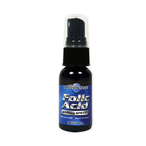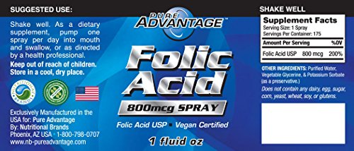 -. Feature : Pure Advantage Folic Acid Spray is great tasting rapid absorbing spray that delivers 800 mcg of USP grade folic acid per serving; sprays are known to be more effective and get the folic acid in the blood stream quicker than folic acid capsules or pills / Folic acid, also known as folate, is a B vitamin is a brain food and is needed for cell replication, growth, and the maintenance of cells / Our folic acid spray is great tasting and contains no sugar, artificial colors, or sweeteners, dairy, egg, sugar, corn, yeast, wheat, soy, or gluten; all Pure Advantage products are produced in an FDA regulated facility to ensure quality / As one of the B vitamins, folic acid acts as a co-enzyme in the formation of red blood cells and nucleic acid, it plays a role in the breakdown and utilization of protein, and aids in the performance of the liver along with promoting both mental and emotional health / Shake well before using Pure Advantage Folic Acid Spray; 1 oz of like folic acid per bottle, or 175 servings
