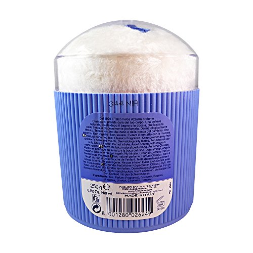 Talcum has always been the symbol of the "Felce Azzurra" brand. A totally natural product, without added colouring agents and preservatives. The unmistakable Felce Azzurra's fragrance - the perfume of wellness - is the unique ingredient which has been added to this natural soft mineral powder. After being spread on the body, the product leaves your skin dry, velvety and silky. The bottle is also available with a powder-puff.Talc superior powder: this is one of Italy's best selling, natural body powders. Soften your body, freshen bed linens and towels with this clean & pure body powder. Naturally scented with floral oils. Bring home a piece of Italian luxury today. Silky feel and a fine delicate fragrance that will keep you fresh all day. Enhance your sleeping experience with a dusting of talc on the bed sheets. For external use only, do not ingest.