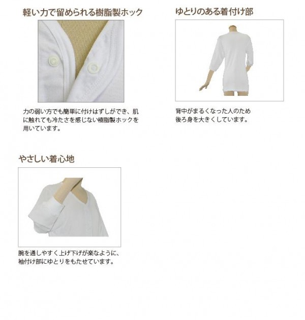 吸収性に優れ、肌触りのよい綿素材を用いた厚手の肌着です。取りはずしが楽に行えるホックを採用しています。