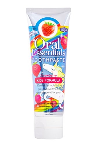-. Feature : Certified Non-Toxic, Fluoride Free, Dentist Formulated & Recommended, SLS Free, Paraben Free, Preservative Free, Gluten Free, Dye Free, No Harsh Chemicals, and tastes great / Natural Flavors & Tastes Great! This delicious tasting toothpaste is made from naturally derived ingredients, and freshens with essential oils to support oral health and visibly reduce redness of gums. Kids love our natural strawberry flavor / Dentist Formulated & Recommended - Oral Essentials offers a unique approach to oral care with a full line of products created and designed by 2 world-renowned dentists and tested against the leading brands in studies all over the world / Healthy Looking Teeth & Gums - Oral Essentials Kids Formula toothpaste utilizes Dead Sea salt, Xylitol, French Essential Oils and Organic Aloe Vera juice to clean teeth and reduce redness of gums in just weeks. Plus, it's Unicorn approved / Xylitol - Oral Essentials uses Non-GMO xylitol made from birch trees to sweeten our formulas and reduce the risk of tooth decay. This alternative to sugar has been used safely in oral care products for decades