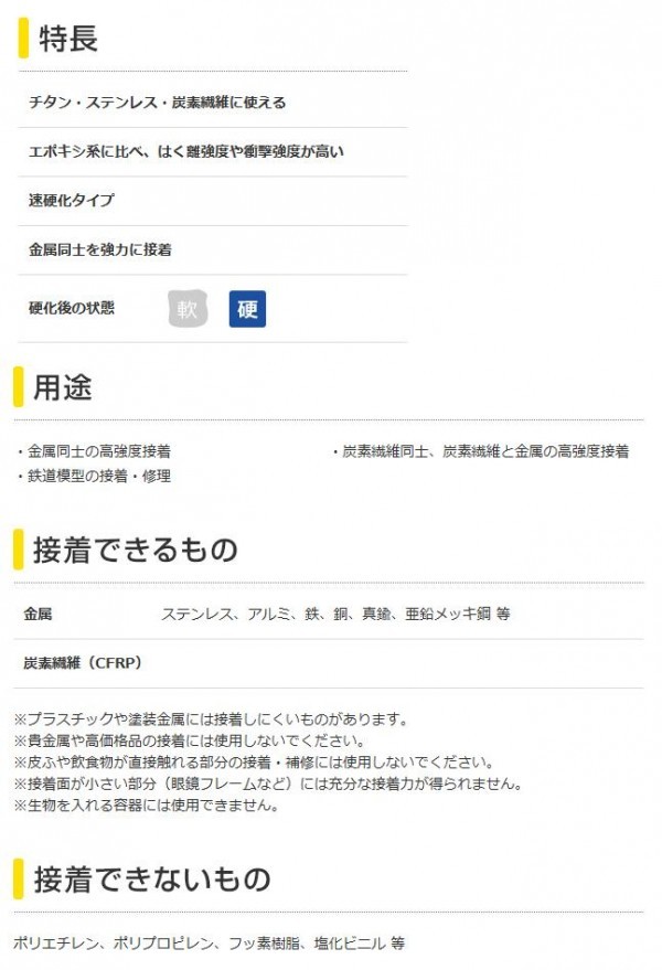 | 2液混合型アクリル樹脂系の強力接着剤です。硬化後はとても硬く、金属(チタン・ステンレス・アルミニウム・鉄・銅など)、カーボン(炭素繊維)などを強力に接着できます。 |