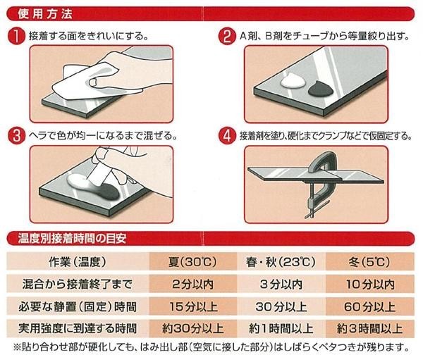 2液混合型アクリル樹脂系の強力接着剤です。硬化後はとても硬く、金属(チタン・ステンレス・アルミニウム・鉄・銅など)、カーボン(炭素繊維)などを強力に接着できます。 |