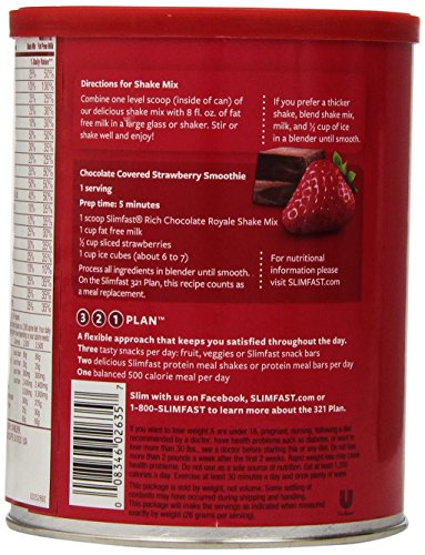 -. Binding : Health and Beauty -. Brand : Slim-Fast -. EAN : 0008346026357 -. Feature : Health Supplement / Great Taste / Leading Brand / 200 calories / Up to 4 hours of hunger control with 10 grams of protein and 4 grams of fiber per serving / One-third of your recommended intake for most essential vitamins and minerals / For use as part of the slim-fast 3-2-1 plan -. Label : AmazonUs/SLJ4Y -. Manufacturer : AmazonUs/SLJ4Y -. NumberOfItems : 1 -. PackageQuantity : 1 -. ProductGroup : Pantry -. ProductTypeName : HEALTH_PERSONAL_CARE -. Publisher : AmazonUs/SLJ4Y -. ReleaseDate : 2015-02-10 -. Studio : AmazonUs/SLJ4Y -. Title : Slim Fast Original, Meal Replacement Shake Mix, Rich Chocolate Royal, 12.83 Ounce -. UPC : 008346026357