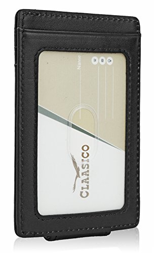 -. Feature : SUPER SLIM - FOR FRONT AND BACK POCKET USE: extremely convenient only 0.12" thick, sizing 2.75" X 4.3" X 0.12 - Easy to insert and remove cards from pocket / MAGNETIC MONEY CLIP + STYLISH GIFT BOX : we used the most strong magnetic discs, to ensure that the money is SAFE and SECURE, it can HOLD UP TO 20 BILLS SAFELY, And nicely packed in a stylish gift box / 3 CARD SLOTS + FRONT WINDOW ID HOLDER + CENTER POCKET: Our wallets are very functional, it features 3 card slots to place your most frequently used cards, it has a PVC window to keep your photo ID, it avoids unnecessary taking out the ID from the wallet, It also has a center pocket for keeping additional cards or bills / 100% GENUINE LEATHER: We use top grain 100% Handmade Genuine Leather, it has a soft feel, and very durable for a Lifetime use / TOP TECHNOLOGY RFID BLOCKING: - APPROVED BY INDEPENDENT LABORATORY TEST. Protects your vital information in cards from being stolen. Blocks 13 .5 MHZ Freqency Credit cards, Debit cards, Driver's license & ID Cards. Cards which operates in 125 KHZ, cannot be blocked by this wallet. Access cards, hotel pass, work pass
