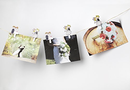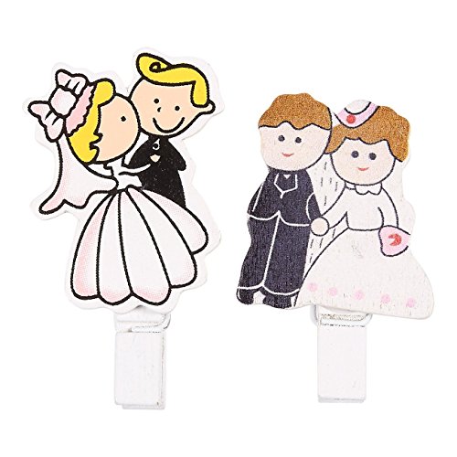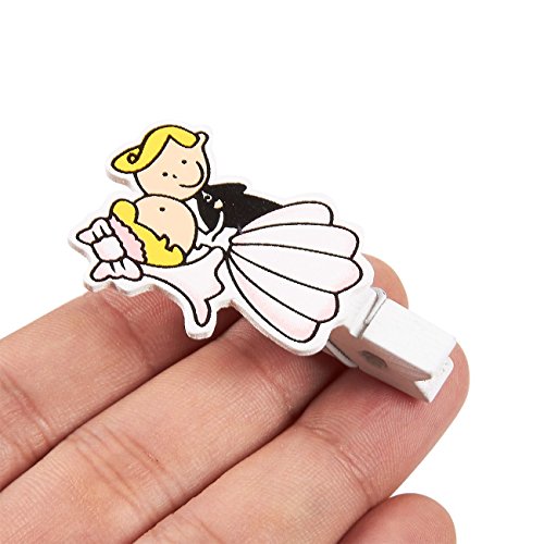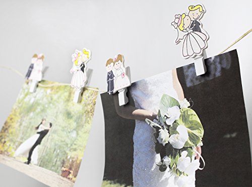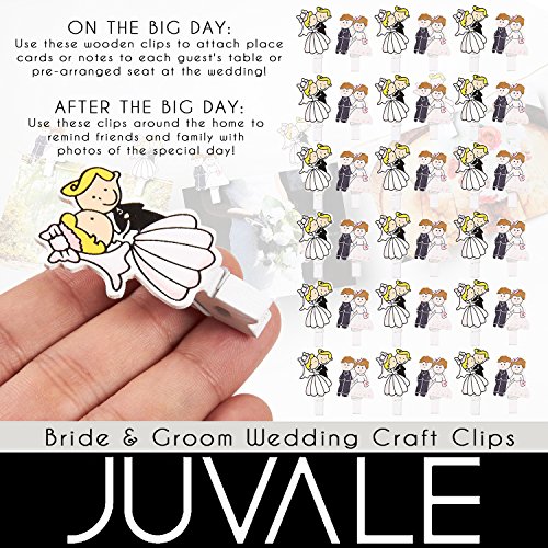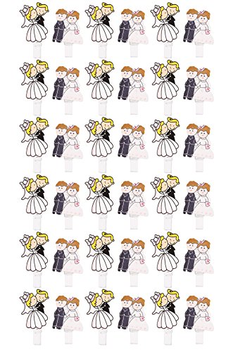 36 CLIPS FOR THE BIG DAY: This set of 36 bride and groom themed wooden clips feature two designs of a smiling newlywed couple