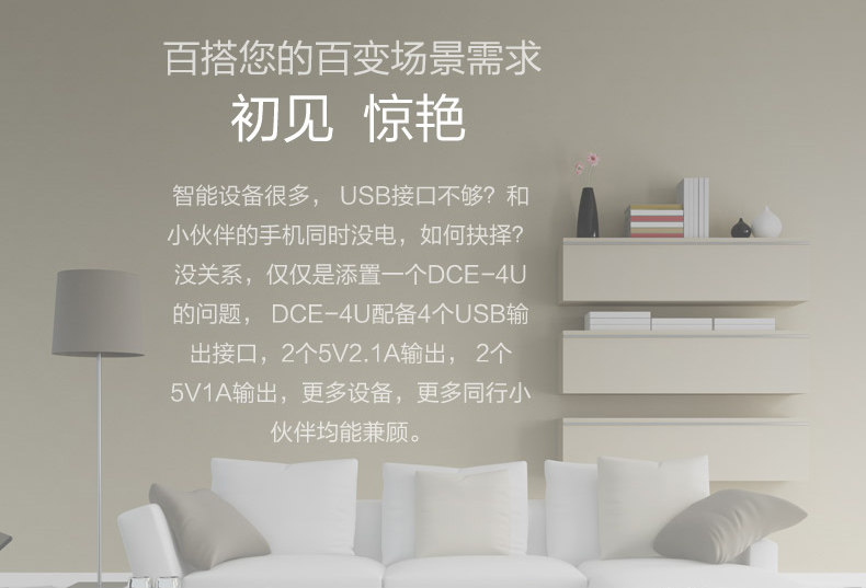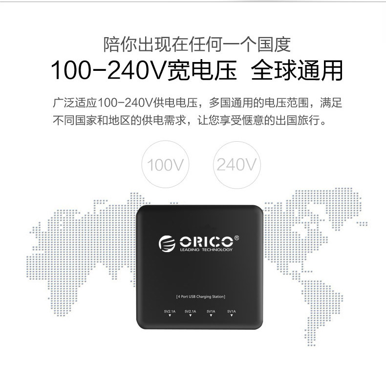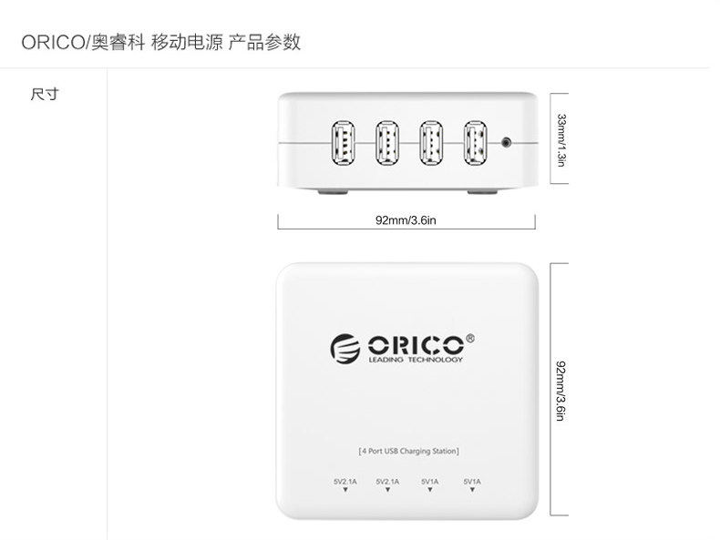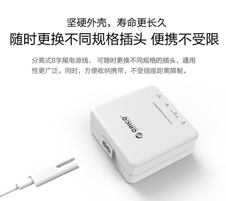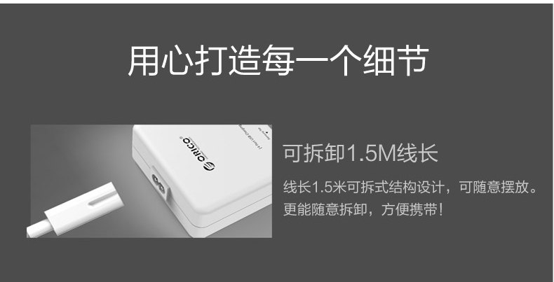 ORICO DCE-4U桌面式设计,简约大气,占用空间少。提供4个USB接口,方便多款设备同时充电,让桌面环境更整洁。配备1.2米超长易收纳电源线,无论是客厅、书房、电视墙、床头柜还是办公桌,移动方便自由,充电更随意。