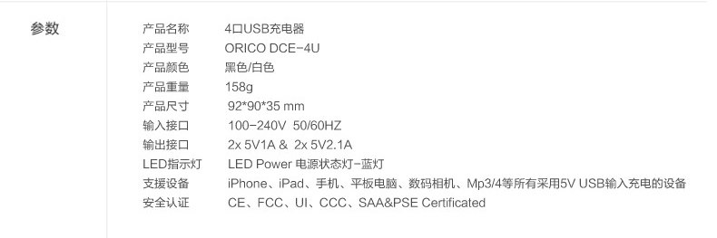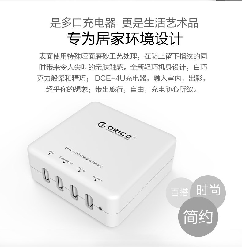 总结:ORICO DCE-4U 数码充电器,外观简约大气,桌面式带线设计摆放不受限制;4个充电接口可以同时连接平板和手机等数码设备进行充电,具备出色的性能与实用性,并安全可靠。是拥有诸多数码设备的用户在家庭、办公室或宿舍中简单而快速解决充电问题的最佳方案。