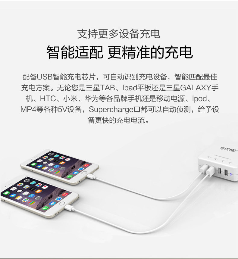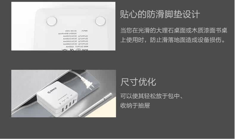 ORICO DCE-4U采用优质进口元器件,首创30W超高功率输出,12V/3000MA超大独立电源,确保即使五个耗电量大型平板、手机同时充电依然充足稳定,轻松应对,互不干扰,持久不发热。由于功率为目前市面上最大,用料实在,尺寸可能稍微偏大一些,设计师考虑,设计在接受范围。