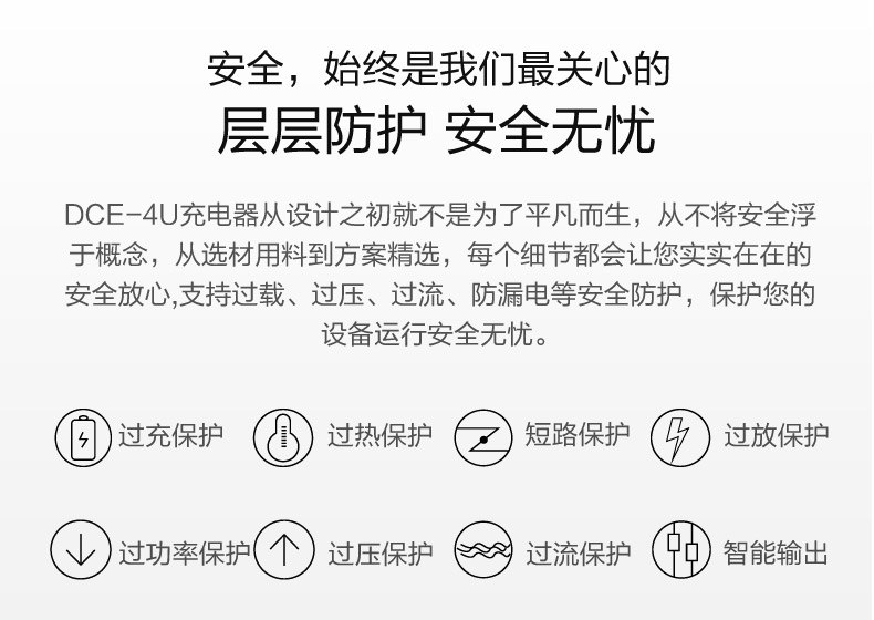 ORICO全新推出的DCE-4U原创设计USB数码充电器,提供两个5V/1A USB充电接口和两个5V/2.1A USB充电接口,支持手机、平板、移动电源、数码相机、MP3/4等所有采用5V USB输入充电的设备,可同时为4个设备充电或供电。且安全稳定,有多重智能保护机制,保护设备和人身安全。