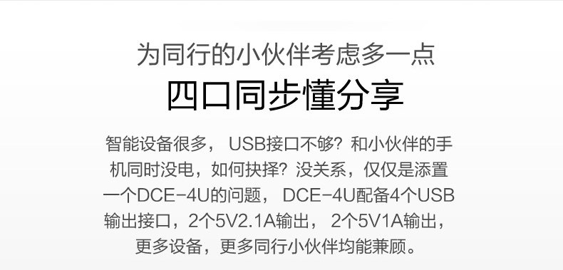 DCE-4U是一款桌面式数码充电器,带一条电源数据线,桌面式带线设计摆放不受限制。