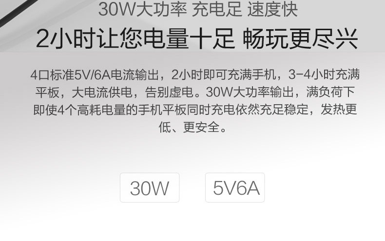 4个USB接口设计,2个5V/2.1A的快充接口,2个5V/1A接口。无论是什么品牌手机、平板电脑还是移动电源、MP4等各种5V设备,接口都可以自动侦测,给予设备最佳最快充电电流,不需要另行购买充电转接头。