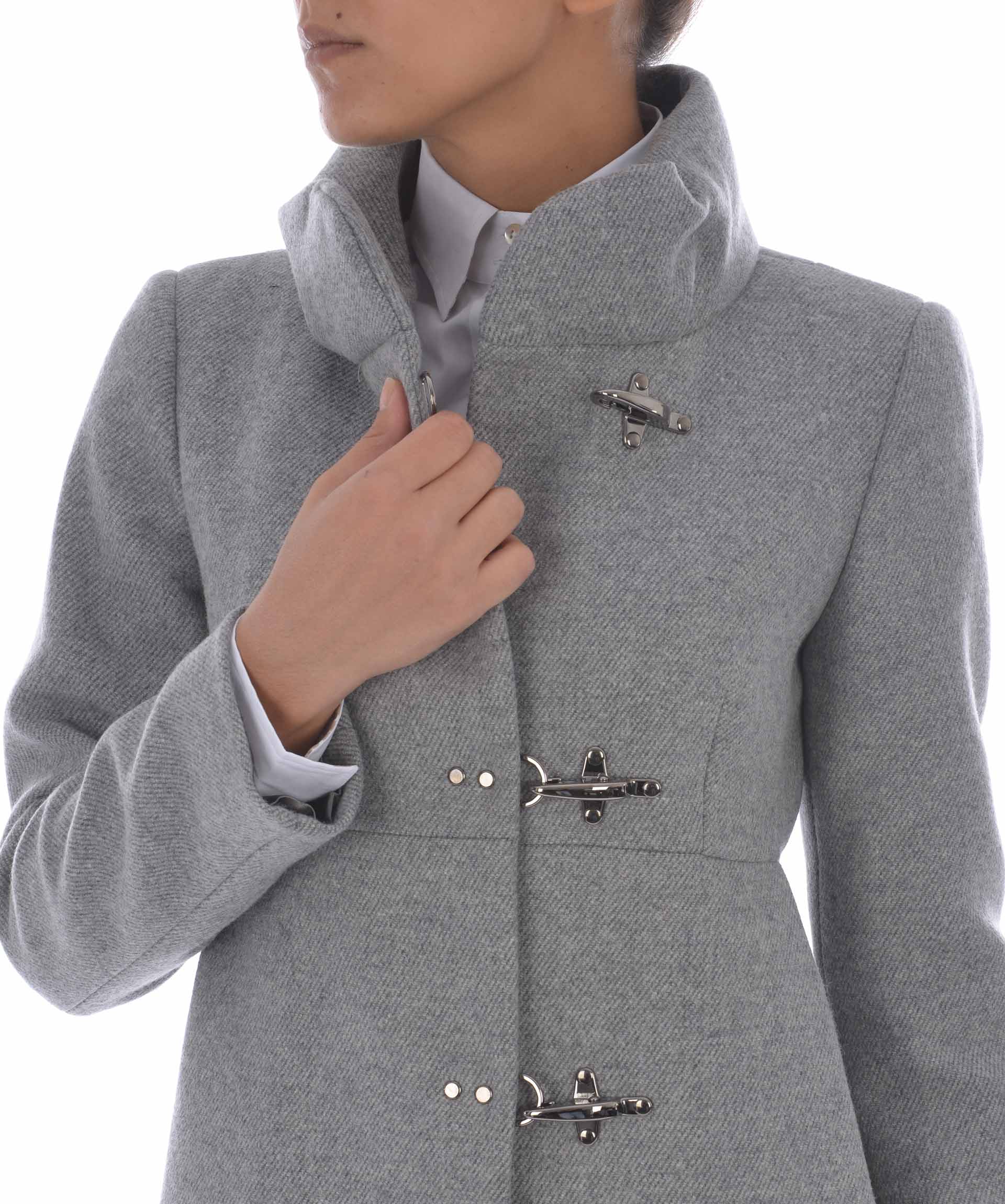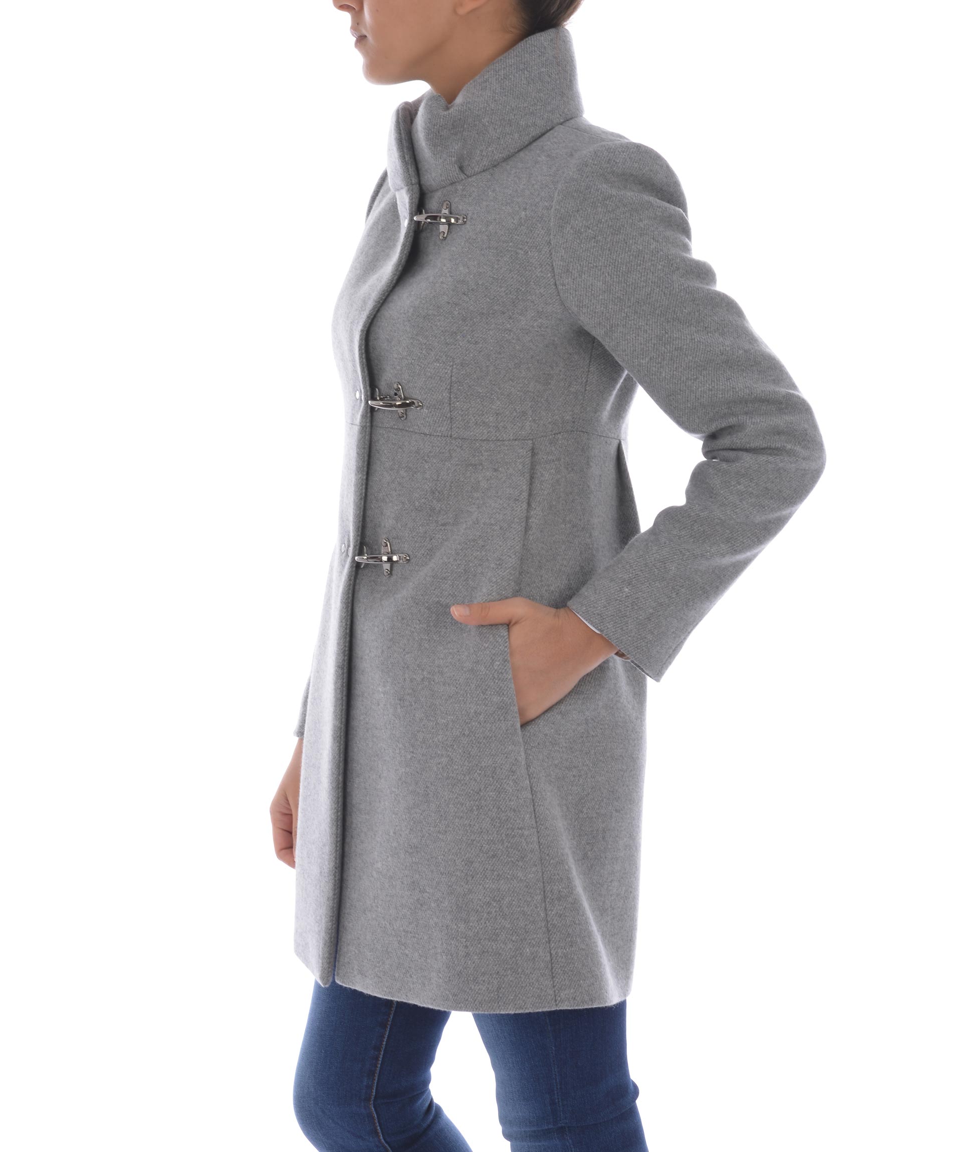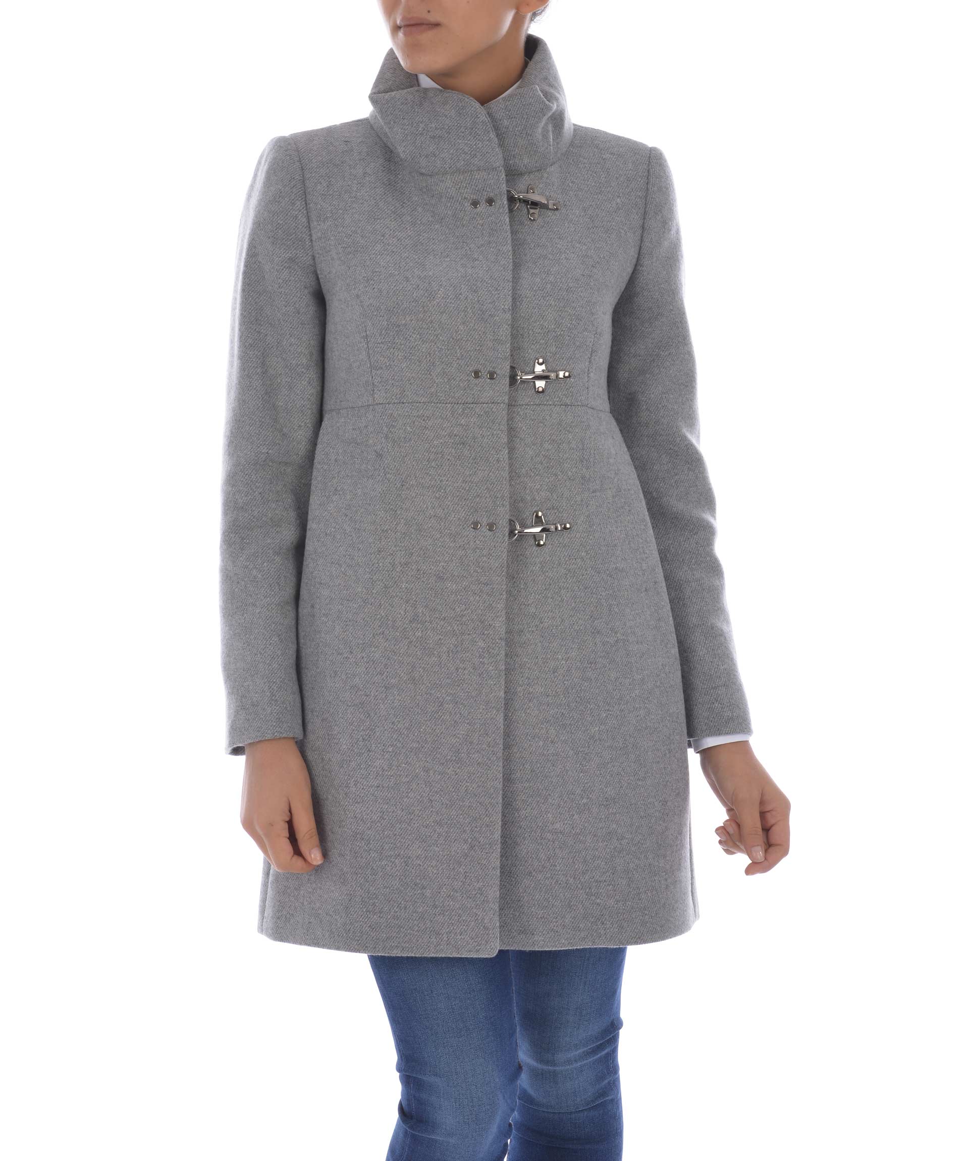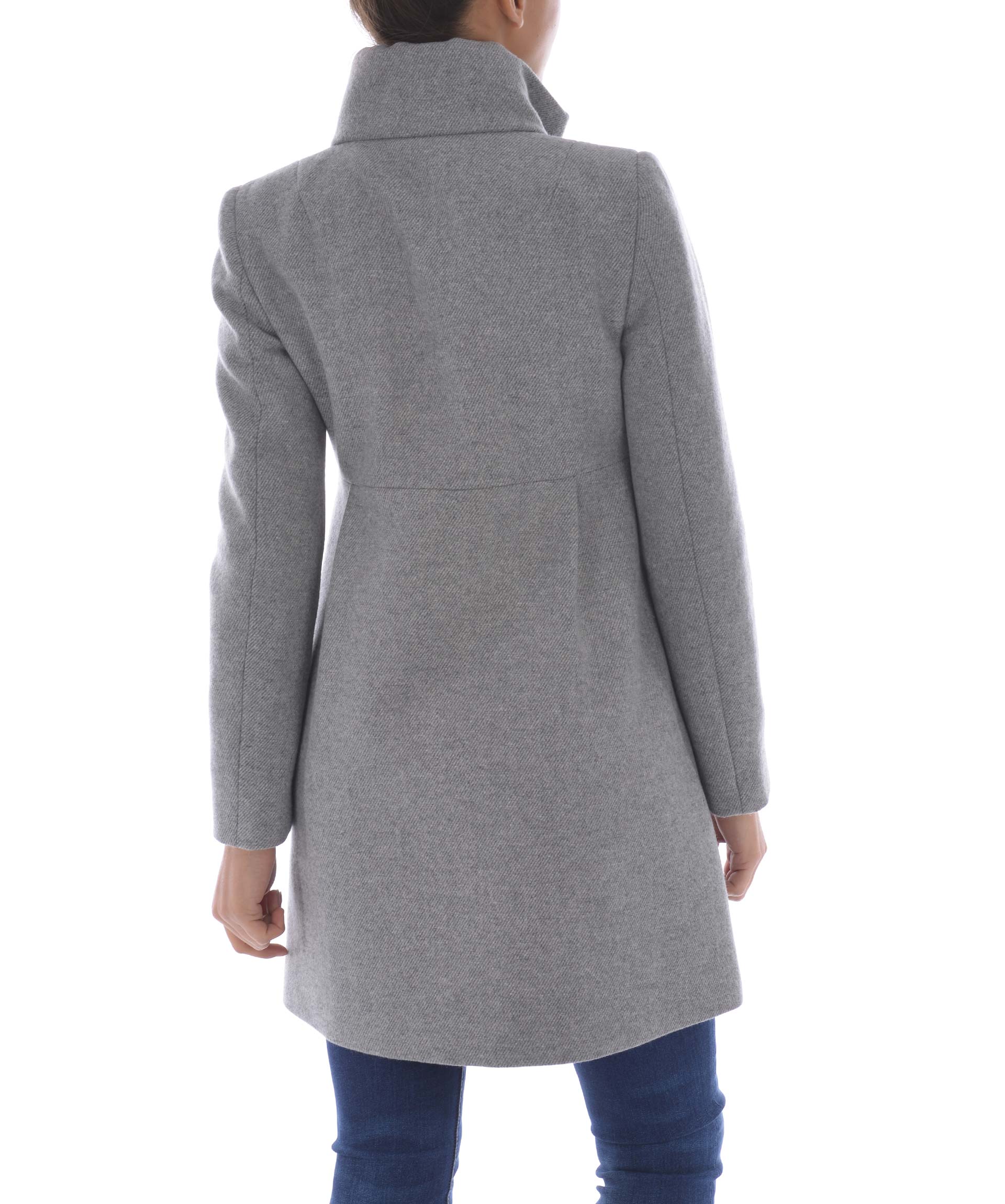 Cappottino Fay in misto lana Grigio melange. Collo alto voluminoso. Apertura con 3 ganci in metallo imbrunito. Grosse pinces frontali con tasche inserite all'interno. Pinces sul retro. Modello svasato. Foderato.