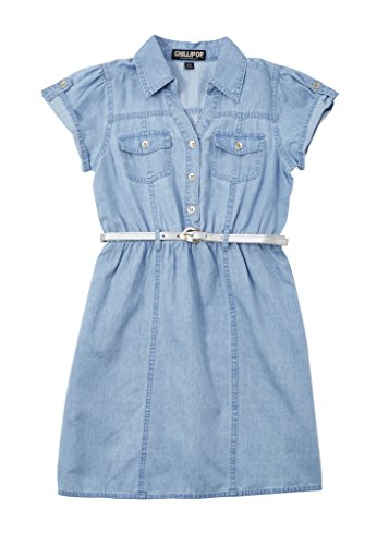 -. Title : Chilipop Light Blue Denim Dress for Girls, Front Pockets, Belted, Flared Skirt