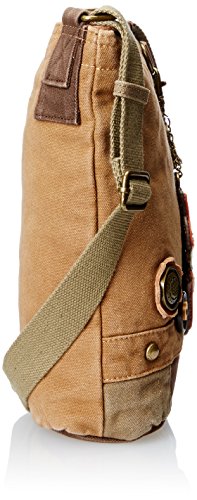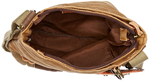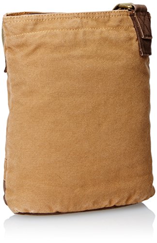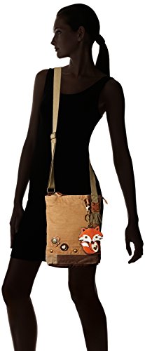 -. Feature : Be Foxy with a detachable Fox key fob/ coin purse / Top zip closure. One interior zippered pocket / Fully lined. Two interior slide pockets. / Material: Washed canvas cotton, leather, & textured faux leather / Approx. measurements: 10"W x 4"D x 10.5"H, Shoulder strap length: adjustable from 13" to 26"