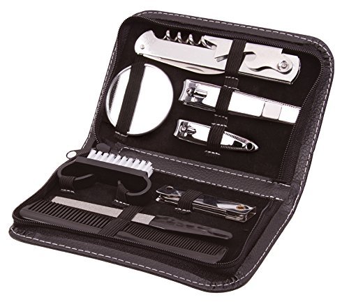 -. Feature : 9 Pc. Set / Includes a comb, nail file, two 3-in-1 multi-tools, brush, nail clipper, toe nail clipper, mirror & travel case / Great set for any guy on the go!