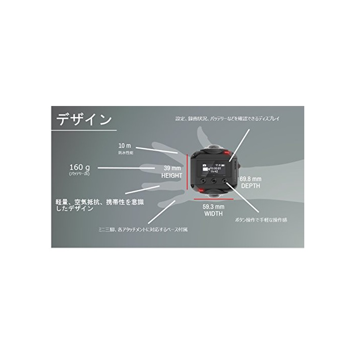 본체 사이즈:39.0 x 59.3 x 69.8 mm / 중량: 160g(함배터리) / 배터리:약65분(4K/30fps) / 방수 성능:10m방수 / 마이크:4방향 / GPS:GPSGLONASS / 내장 센서:기압 고도 kompas 가속도계 / 보이스 콘트롤:가능 / 언어:영어 일본어 중국어 등 / VR기기 대응:대응 / 라이브 송신:IOS어플리케이션에 가능 / 기록 메모리:microSD최대128GB / 360°동영상:표준 모드4K 3840×2160(30FPS)RAW모드5.7K 2880×2880(30FPS)※VIRB리모트 어플리케이션 필요360°미가공5K 2496×2496(30FPS) / 360°정지화면:최대15MP 5640×2816 / 비디오 촬영 모드:비디오 타임 플러스 슬로우※슬로우 촬영은 렌즈 모드가 프론트/RAW만