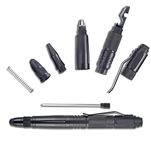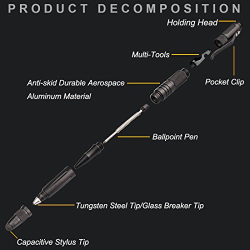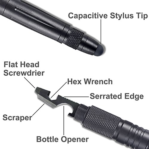 -. Feature : ✔ MULTIFUNCTIONAL TACTICAL PEN - The aluminum alloy tactical pen consists of 4 part: Capacitive Stylus Pen for touch screen device + High Quality Metal Black Ball Pen + Tungsten Steel Glass Breaker + Bottle Opener / ✔ EMERGENCY SURVIVIAL Tool - Small tungsten steel tip features high hardness, impeccable wear-resisting and corrosion resistance, in an emergence it help to breaker windows to survive. / ✔ PRACTICAL COMMEN TOOL- Screw off the cap of pen, you can get a dismountable a useful multipurpose tool, including bottle opener, flat head mini-screwdriver and serrated edge. / ✔ NICE BUSINESS PEN & UNIVERSAL CAPACITIVE STYLUS - Also a black ball point pen that provides fluent writing, and a capacitive stylus pen compatible with all touch screen device like smart phone and tablets. / ✔ PREMIUM INTEGRATED WRITING TOOL AND EMERGENCY TOOL - Design in gentle, compact profile, has the advantages of hooking onto backpack, briefcase and shirt pocket; Act as a bodyguard when necessary.