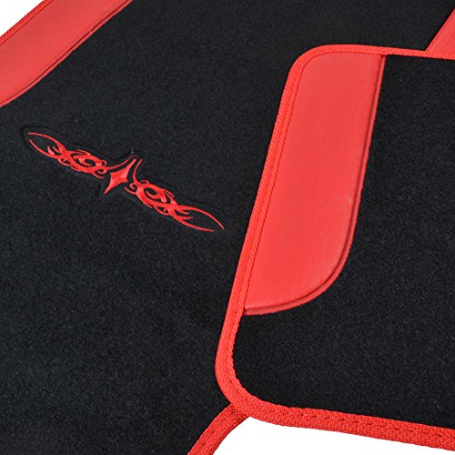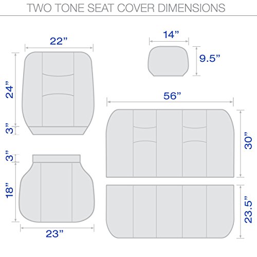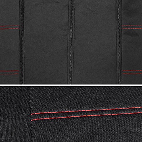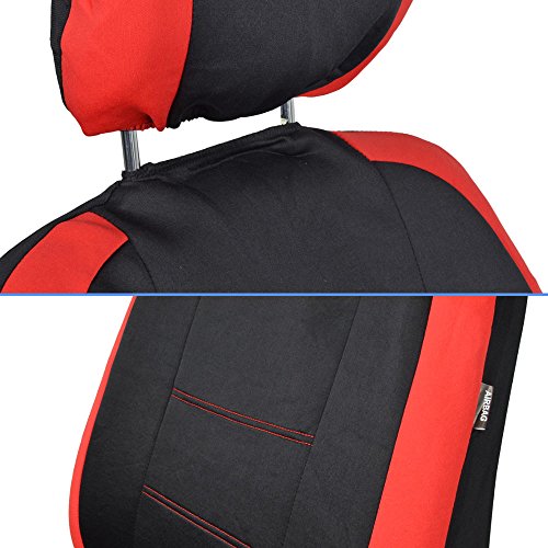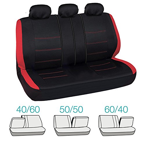 - Feature : New "Venice" Design - Red Accent Side Stripes / Black Vinyl Trim Floor Mats Included / Includes Front Bucket Seat Covers, Rear Split Bench Cover, 5 Headrest Covers & 4pc Floor Mats / Polyester Seat Covers with a split bench seat cover and Double Stitched Seams for added durability / Universal Fit: Front seat: 23 inches wide x 18 inches long / Front backrest: 22 inches wide x 24 inches long / Rear bench seat: 56 inches wide x 23.5 inches long/ Rear bench backrest: 56 inches wide x 30 inches long