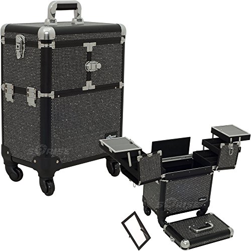 -. Binding : Misc. -. Brand : SunRise -. EAN : 4913213196131 -. Feature : High quality aluminum finish and construction with reinforced steel corners for extra durability / Beautiful new black krystal pattern finish with black aluminum trimming / Heat resistant exterior material keeps the case cool and protects your cosmetics / Heavy duty handle for added comfort and grip / Overall case dimension (LxWxH): 14.5" x 9.5" x 21" -. IsAdultProduct : 0 -. Label : Sunrise -. Manufacturer : Sunrise -. MPN : C6304KLAB -. PartNumber : C6304KLAB -. ProductGroup : Beauty -. ProductTypeName : BEAUTY -. Publisher : Sunrise -. Studio : Sunrise -. Title : SUNRISE Professional Makeup Case on Wheels C6304 Aluminum, Two 3 Tier Trays, 4 Wheel Spinner, Locking with Mirror, Black Krystal