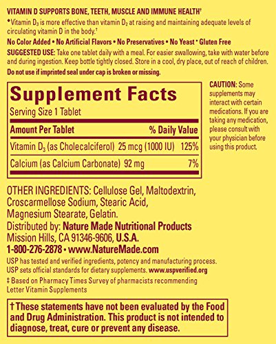 Nature Made Vitamin D 1000 IU Maximum strength for bone & joint protection. Premium Tablets 100 ct.