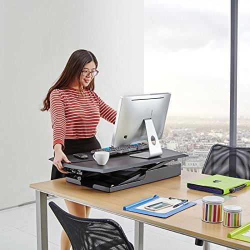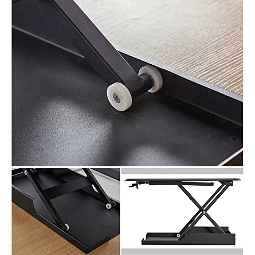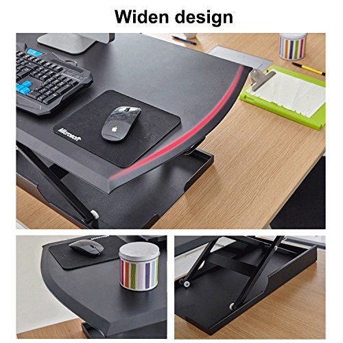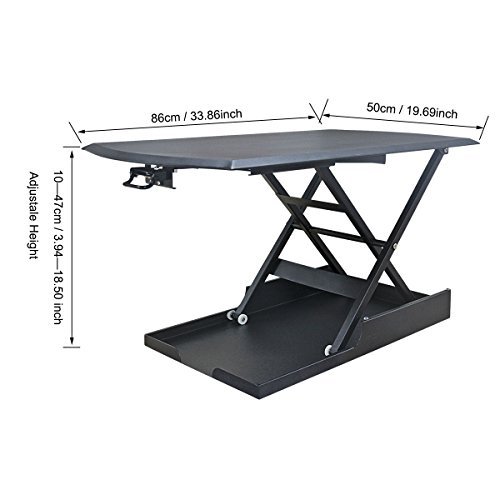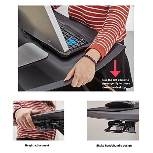-. Feature : ADJUSTABLE HEIGHT RANGE: Standing height is 3.9-18.5inch. You could easily adjust to your ergonomic height to protect your spine. / MULTI-FUNCTION DESK: This adjustable standing desk could convert any desk to a sit/stand up desk. It lift up and down in seconds with hand-levers, giving you the biggest comfort. / BALANCED AND STABLE: During the lifting process, the desktop is always level and stable. / FULLY ASSEMBLED: No assembly required - just open the box, place your computer, mouse and keyboard on top of the desk, and start standing! / SIMPLE AND MODERN DESIGN: The widen radian provides bigger working space to you. You will be more comfortable and effecient when you are working.