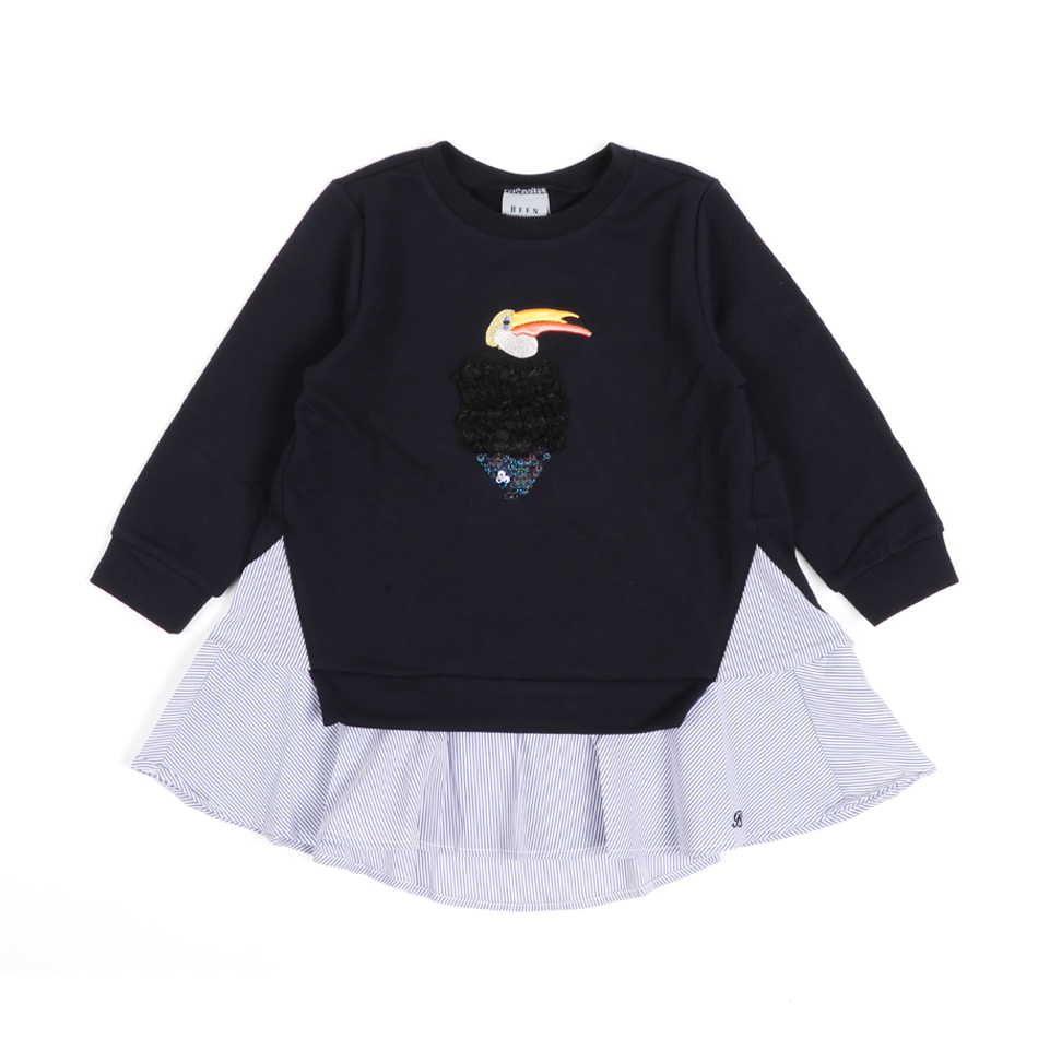 선명한 네이비 컬러의 크롭니트와 블루 스트라이프 블라우스를 레이어드하여 스타일링 한 듯한 연출을 해주는 티셔츠 아이템입니다. 세련된 컬러감이 보여지는 고급스러운 자수와 비즈 포인트가 다크하고 선명한 컬러감으로 포인트가 됩니다. 스키니,레깅스 아이템과 세련된 여아의 스타일링을 제안할 수 있습니다.