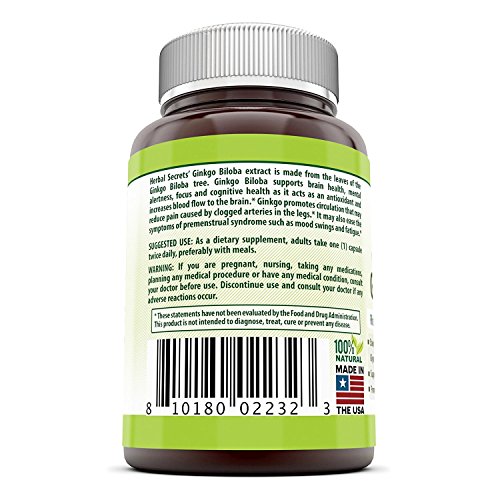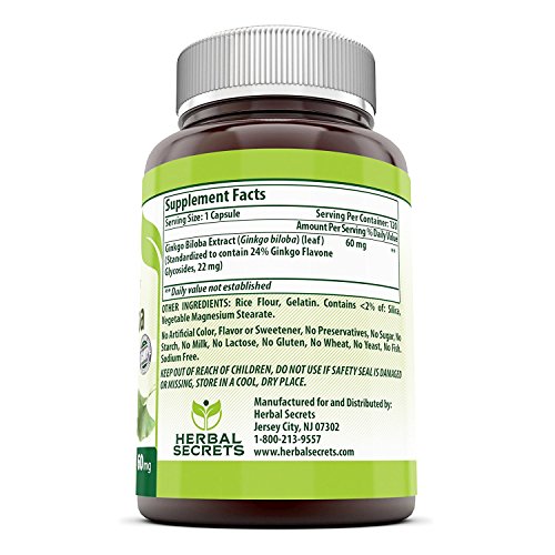 Herbal Secrets Ginkgo Biloba Supplement - 60 mg Ginkgo Leaf Extract (Standardized to Contain 24% Ginkgo Flavone Glycosides) in each Capsule - Memory...