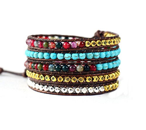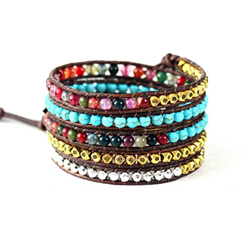 -. Binding : Jewelry -. Brand : Carolyn Jane's Jewelry -. Color : Brown -. Department : womens -. Feature : This exquisite handmade leather wrap bracelet has swirls of synthetic turquoise beads and mixed agate for a pop of color and complimented with gold tone and silver tone beads. The ornate button adds a little western flare / Hand sewn onto strands of antique leather / 5x to 6x wrap (40" in length) with 3 loop closure for easy resizing / This wrap has a "BIG" personality; With all the twist of colors this bracelet has to offer, it will surely become your favorite / 4mm beads -. Label : Carolyn Jane's Jewelry -. Manufacturer : Carolyn Jane's Jewelry -. Model : MFW-001 -. MPN : MFW-001 -. PartNumber : MFW-001 -. ProductGroup : Jewelry -. ProductTypeName : FASHIONNECKLACEBRACELETANKLET -. Publisher : Carolyn Jane's Jewelry -. Size : medium large -. Studio : Carolyn Jane's Jewelry -. Title : Leather Wrap Bracelet with Synthetic Turquoise and Mixed Agate Colorful Beads