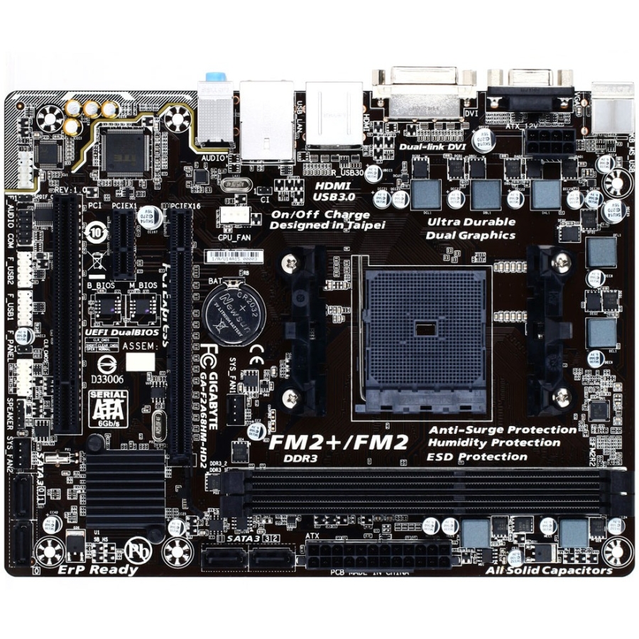 Audio Sound Controller Manufacturer: Realtek Sound Controller Model: ALC887 Audio Channels: 7.1 Interfaces/Ports HDMI: Yes DVI: Yes VGA: Yes Number of Network (RJ-45) Ports: 1 Network (RJ-45): Yes Audio Line In: Yes Audio Line Out: Yes Number of DVI Outputs: 1 Number of HDMI Outputs: 1 Microphone Port: Yes Total Number of USB Ports: 6 Number of USB 2.0 Ports: 4 Number of USB 3.0 Ports: 2 PS/2 Port: Yes Number of PS/2 Ports: 1 General Information Product Type: Desktop Motherboard Manufacturer Part Number: GA-F2A68HM-HD2 Manufacturer Website Address: http://www.giga-byte.com Manufacturer: GIGABYTE Technology, Inc Product Model: GA-F2A68HM-HD2 Product Name: Ultra Durable 4 Plus GA-F2A68HM-HD2 (rev. 1.0) Desktop Motherboard Product Line: Ultra Durable 4 Plus Brand Name: Gigabyte I/O Expansions Number of PCI Slots: 1 Number of PCI Express x1 Slots: 1 Number of Total Expansion Slots: 3 Number of PCI Express x16 Slots: 1 PCI Express Standard: PCI Express 3.0 Total Number of PCI Express Slots: 2 Memory Maximum Memory: 64 GB Memory Technology: DDR3 SDRAM Memory Standard: DDR3-2400/PC3-19200 (O.C.) Number of Memory Slots: 2 Memory Form Factor: DIMM Miscellaneous Package Contents GA-F2A68HM-HD2 Desktop Motherboard Bundle Software Certifications & Standards CE FCC BSMI ACPI 5.0 Green CompliantYes Green Compliance Certificate/AuthorityWEEE Network & Communication Gigabit Ethernet: Yes Physical Characteristics Form Factor: Micro ATX Width: 8.9" Depth: 6.9" Power Description Power Supply Supported: ATX12V Processor & Chipset Processor Supported: Athlon Total Processor Supported: 1 Processor Socket: Socket FM2+ 64-bit Processing: Yes Chipset Manufacturer: AMD Chipset Model: A68 Multi GPU Supported: Hybrid CrossFire Video Graphics Controller Manufacturer: AMD Graphics Controller Memory: 2 GB Graphics Memory Technology: DDR3 SDRAM Graphics Memory Accessibility: Shared Onboard Video: On-board Video Chipset Warranty Limited Warranty: 3 Year I/O Controller RAID Levels: 0 Controller Type: Serial ATA/600 RAID Supported: Yes Onboard Interfaces Number of SATA Interfaces: 4 Total Number of Onboard USB Ports: 4 Number of Onboard USB 2.0 Ports: 4 Onboard Audio Header: Yes Onboard S/PDIF Header: Yes Onboard Serial Header: Yes Integrated Processor