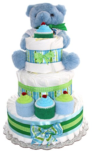 3 Tier Diaper Cake - Blue Teddy Bear Diaper Cake For Boy - Baby Gift For Baby Shower - Teddy Bear Theme - Diaper Cake Is Decorated With Cupcakes Made...