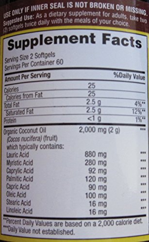 Dietary Supplement Healthy Nutrition With Lauric Acid 1000mg Per Softgel Natural Energy Source* Essential Fatty Acids Coconuts are enjoyed in tropical regions around the world as a delectable fruit. Now you can enjoy the benefits of Coconut Oil in a convenient softgel. Along with essential fatty acids, this product contains Medium Chain Triglycerides (MCTs). MTCs are oxidized differently in the body than other fats, making Coconut Oil a readily available energy source.* No Yeast, No Wheat, No Gluten, No Milk or Milk Derivatives, No Lactose, No Sugar, No Preservatives, No Soy, No Artificial Flavor, No Sodium. 1-800-925-4733 *These statements have not been evaluated by the Food and Drug Administration. This product is not intended to diagnose, treat, cure or prevent any disease.