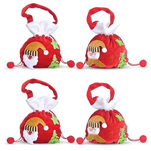 4 pk Christmas Gift Bags Hanging Drawstring Plush Fabric Santa Snowman Holiday Treat Candy Bags for Kids