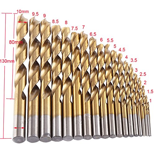 - Including 19pcs of twist drill bits in 19 sizes: 1.0, 1.5, 2.0, 2.5, 3.0, 3.5, 4.0, 4.5, 5.0, 5.5, 6.0, 6.5, 7.0, 7.5, 8.0, 8.5, 9.0, 9.5, 10.0mm