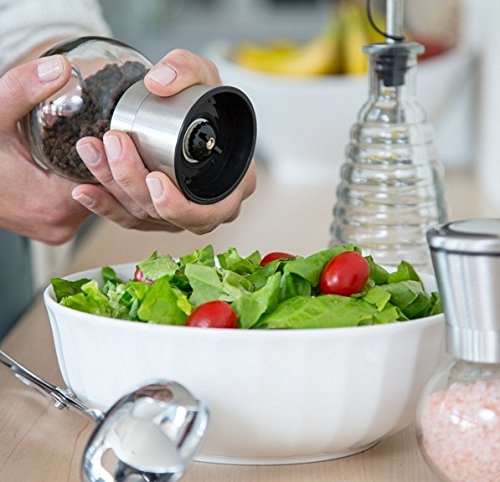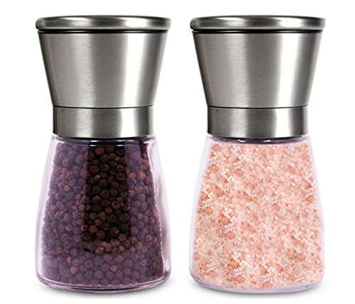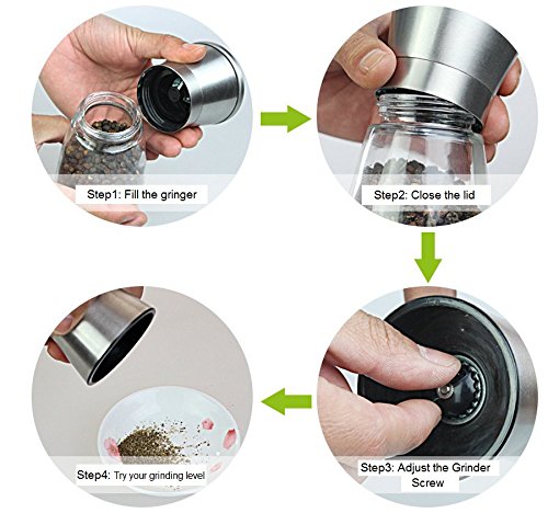 - Modern ans Unique: Stainless Steel and Glass Salt and Pepper Grinder Set - Simple design with no logos or branding that will look elegant and smart on your table at all times and charm your family and guests.