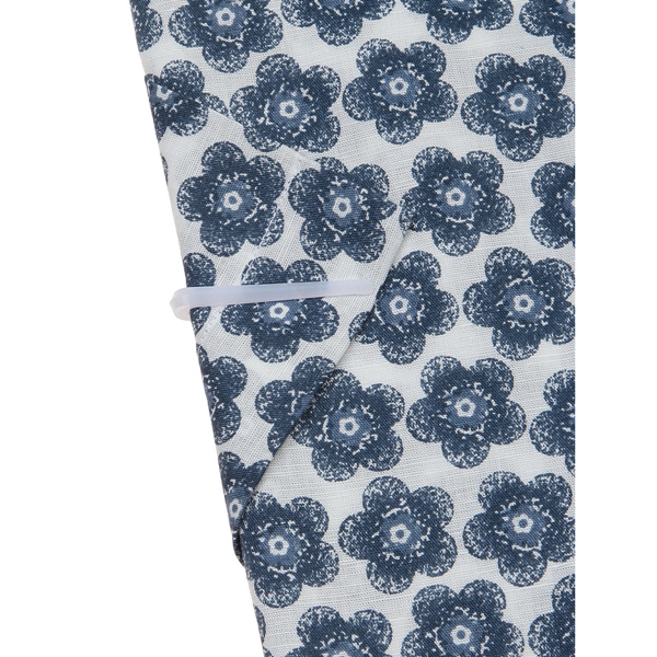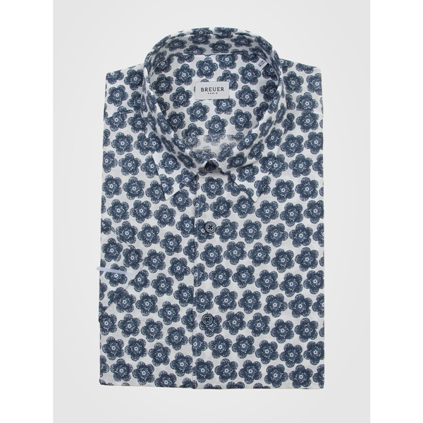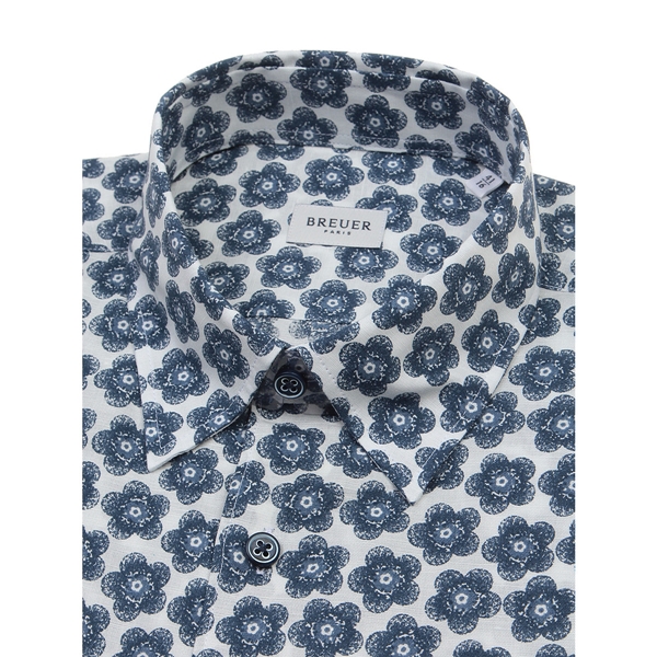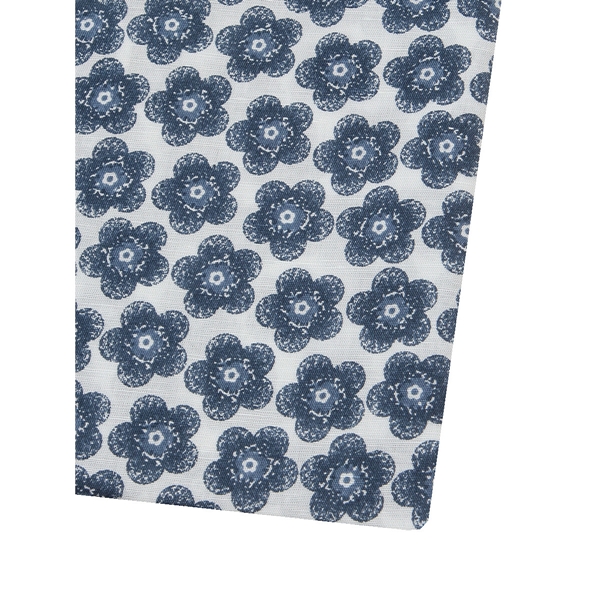 린넨 소재의 화이트 바닥에 네이비 플라워 모티브가 들어간 프린트 반팔셔츠로