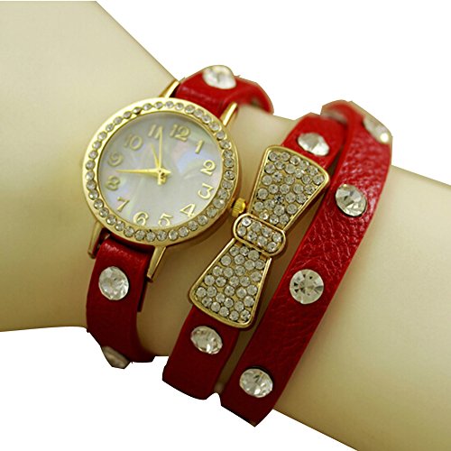 -. Title : JQUEEN Red Bow Design Quartz Fashion Weave Wrap Around Leather Bracelet Lady Woman Wrist Watch