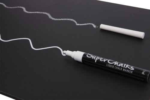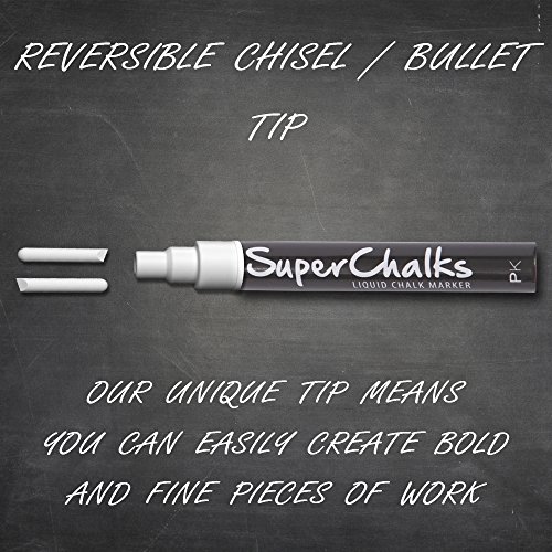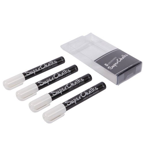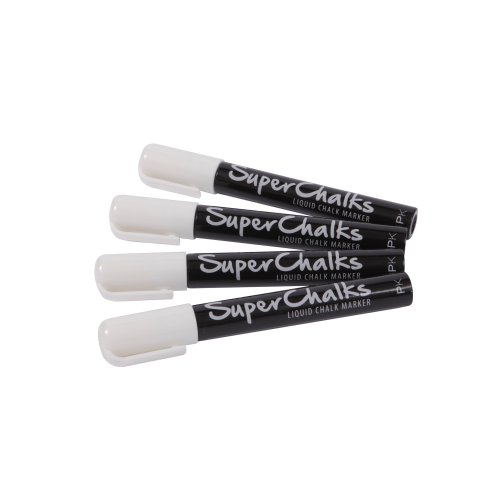 SuperChalks bright white liquid chalk marker (4mm Precision Tip) (Four Pack). The Liquid chalk in SuperChalks is completely dust free... Simply wipe with a damp cloth and watch as it disappears without the regular smudge and mess! Concentrated liquid prevents running and dripping.