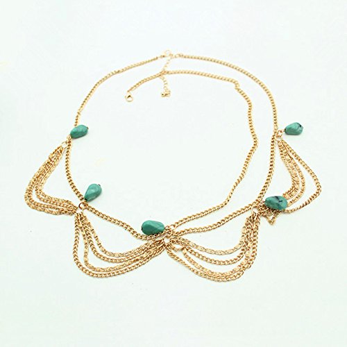New Design Women's Fashion Metal Head Chain Headband, Iron Curb chain Tassels Headbands, with Imitation Turquoise Acrylic Beads, GoldenSize: about 20.8" long; bead: 15x10x8mm.