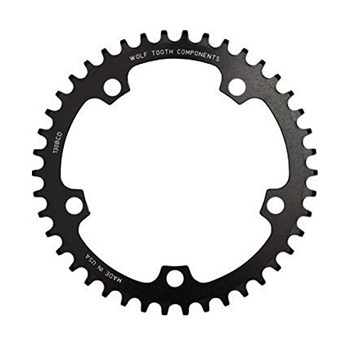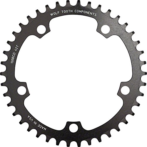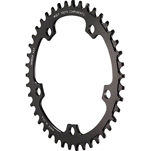 Studio : Wolf Tooth Components Publisher : Wolf Tooth Components Binding : Misc. Product Description The perfect 1x solution for your gravel, CX or road bike. Wolf Tooth's patented Drop-Stop design helps clear mud while retaining your chain. For use with an 11 or 10 speed chainIf riding in extremely muddy conditions, Wolf Tooth recommends a chain guide or chain keeper in addition to a clutch-style rear derailleurNot compatible with 9 speed chainsFor maximum retention, utilize with a clutch-style rear derailleurMade from 7075 Aluminum for long lifeNot compatible with Shimano Asymmetric 110 BCD Cranks or Campagnolo CX10/11 cranks Item SpecificationsColorBlackMaterialAluminumTeeth38Chainring BCD130Defined ColorBlackRing Position/TYPEChain Retaining Single Ring 0