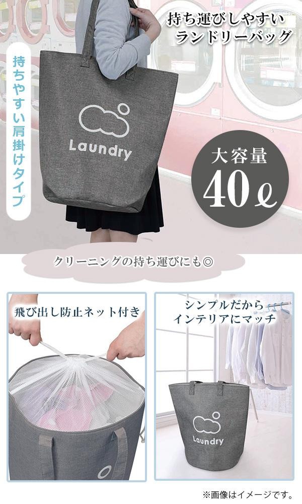 肩がけタイプで持ちやすい!洗濯物の飛び出しを防止する、巾着タイプのネット付き。大容量40リットルです。 |