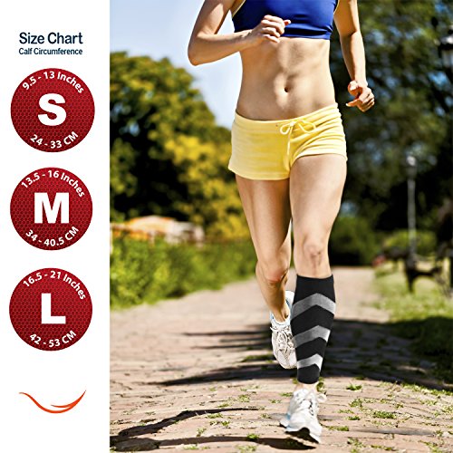 -. Feature : ✮ STABILIZE MUSCLE AND MAXIMIZE YOUR PERFORMANCE - Whether it's for running, cycling, walking, tennis, CrossFit, basketball, baseball, soccer, volleyball, or martial arts, these calf compression sleeves are a great addition to any workout. They also alleviate leg pain for those who stand on their feet all day, such as nurses, cashiers, teachers, frequent travelers, etc. ACT NOW, get the support you need to reach the next level. / ✮ TRUE GRADUATED COMPRESSION STIMULATE FAST RECOVERY, SCIENTIFICALLY PROVEN TO BE EFFECTIVE - Graduated compression dilates your arteries and enhances blood flow 30% - 40%. True Graduated Compression delivers more oxygen to your muscles and reduce the soreness you feel after working out! In another word, it limits swelling & increases blood flow. Graduated compression to Shin & Calf is essential to performance & speedy recovery. Workout harder and recover faster. / ✮ ADD SAFETY TO ANY WORKOUT AND 100% MONEY BACK GUARANTEE- Protects legs from scratches and abrasions during trail running, bicycle through the mountain, or walking through grassy fields. If for any reason, our sleeves do not meet your expectations, let us know and we will give you your money back. Don't Wait! Give these a try, NOW! / ✮ THANKSGIVING, BLACK FRIDAY GIFT, CYBER MONDAY GIFT, CHRISTMAS GIFT, GIFT FOR HIM, GIFT FOR HER, TRUE GRADUATED COMPRESSION REDUCE / PREVENT SHIN SPLINTS, CALF CRAMPS, AND CALF PAIN: Our calf compression sleeves offer true 20-25mmhg compression. Graduated Compression technology not only keeps your muscles warmer during workouts but it also stabilizes lower leg muscles, alleviating shin splints, muscle cramps, and preventing other injuries. They are great for those who travel a lot or are on their feet all day. / ✮ FRONT AND BACK REVERSIBLE (TWO LOOKS IN 1 PAIR), Moisture Wicking and Ventilation Design allows skin to breathe. Front and back reversible creates two styles in 1 pair. Our sleeves are perfect for men and women up to 6'4" in height with calf sizes ranging from 9 inches up to 24 inches.