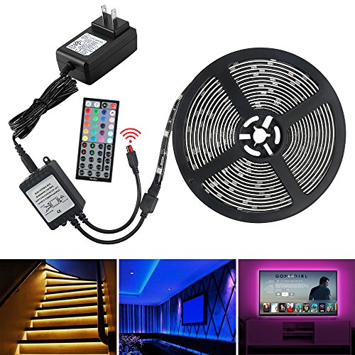 - All in one kit : Comes with a UL approved adapter, a reel of 16.4ft 150 LEDs Waterproof rope light and a Black 44key IR remote . Safe and reliable; Self-adhesive back with better adhesive tape for easy application, Super viscosity and easy installation