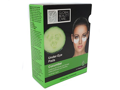 Global Beauty Care Cucumber Under-Eye Pads are blended with Cucumber extract which naturally soothes skin and helps ease puffiness and swelling around the eyes. These unique pads penetrate deep into pores to moisturize and revitalize your tired eyes. Your skin will look as good as it feels...nurtured, smooth and radiant! INGREDIENTS: Aqua (water), Glycerin, Cucumis Sativus (Cucumber) Extract, Panthenol, Tocopheryl (Vitamin E), Sodium PCA, Ascorbic Acid (Vitamin C), Retinol (Vitamin A), Hydroxyethyl Cellulose, Sodium Hyaluronate, Allantoin, Methylisothiazolinone, Phenoxyethanol. TO USE: Cleanse face and remove any makeup. Open one packet (each contains two eye pads). Apply on clean dry skin under each eye, by pressing gently and firmly. Wipe away any excess gel with a cotton pad or tissue. Wear pads for 15-20 minutes for best results. Use 2-3 times per week to soothe and moisturize for more youthful, radiant and beautiful looking eyes! Size: 5 PairsFeature